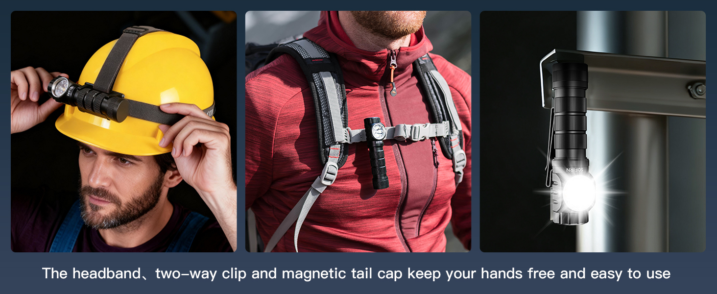Klip a čelovka: Díky robustnímu klipu a popruhu ji lze nosit jako čelovku, připnout k výbavě nebo použít jako inspekční pracovní lampu.