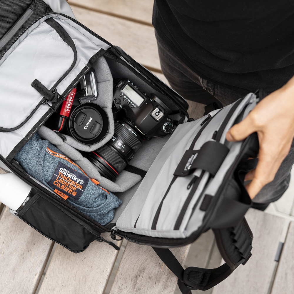 PRVKE Lite je nejlehčí a nejdostupnější model z oceňované série PRVKE. Nabízí vestavěnou ochranu pro fotoaparát, chytrý rozšiřitelný rolltop a rychlý boční přístup k technice i notebooku. Díky voděodolným materiálům udrží vaše vybavení v bezpečí za každého počasí a díky minimalistickému designu se hodí jak na cestování, tak na každodenní nošení do města.