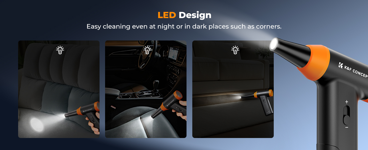 Integrované LED osvětlení: Prach se nejraději schovává v temných zákoutích. Díky vestavěnému světlu vám ale už žádné smítko neunikne, a to ani při čištění hlubokých PC skříní nebo prostorů pod autosedačkou.