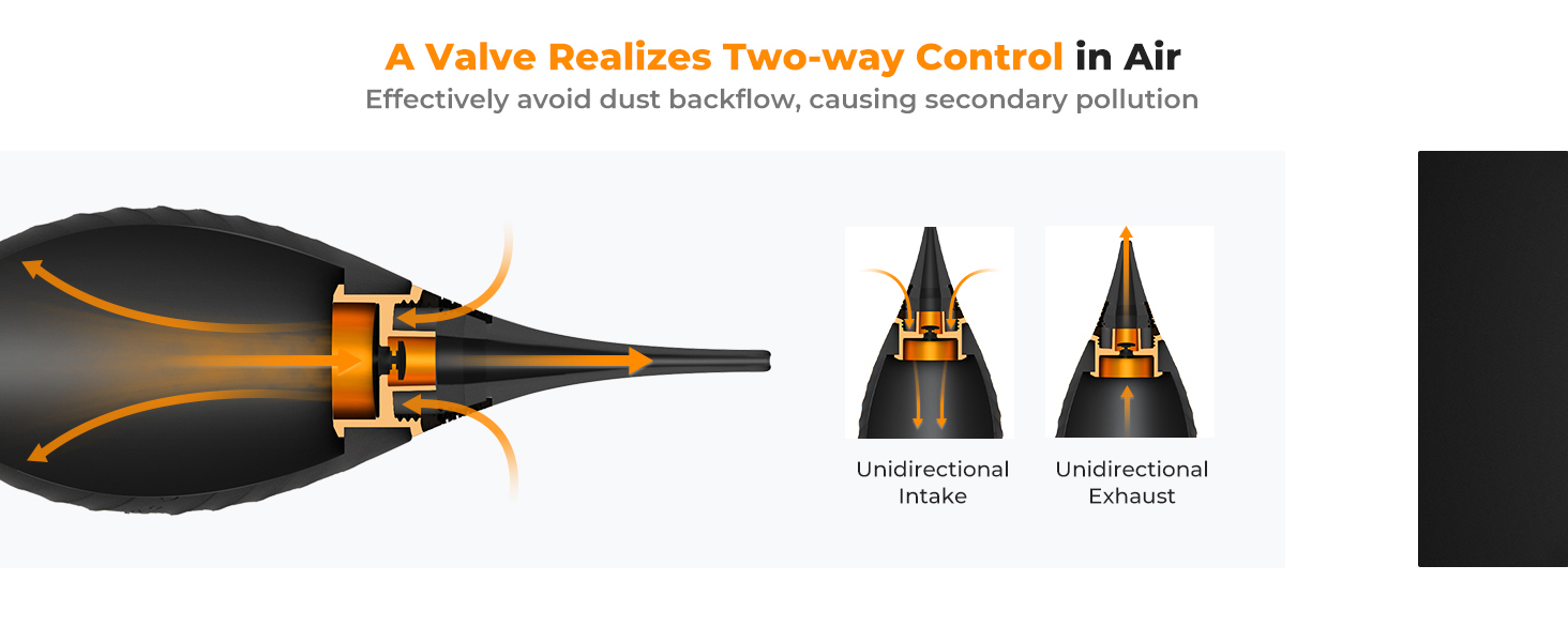 - Exkluzivní inovativní design: Obousměrný řídící vzduchový ventil, který účinně zabraňuje nasávání prachu a zabraňuje zpětnému znečištění. Zároveň tak zlepšuje těsnicí výkon zařízení.