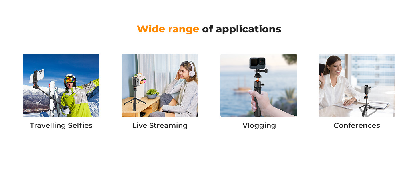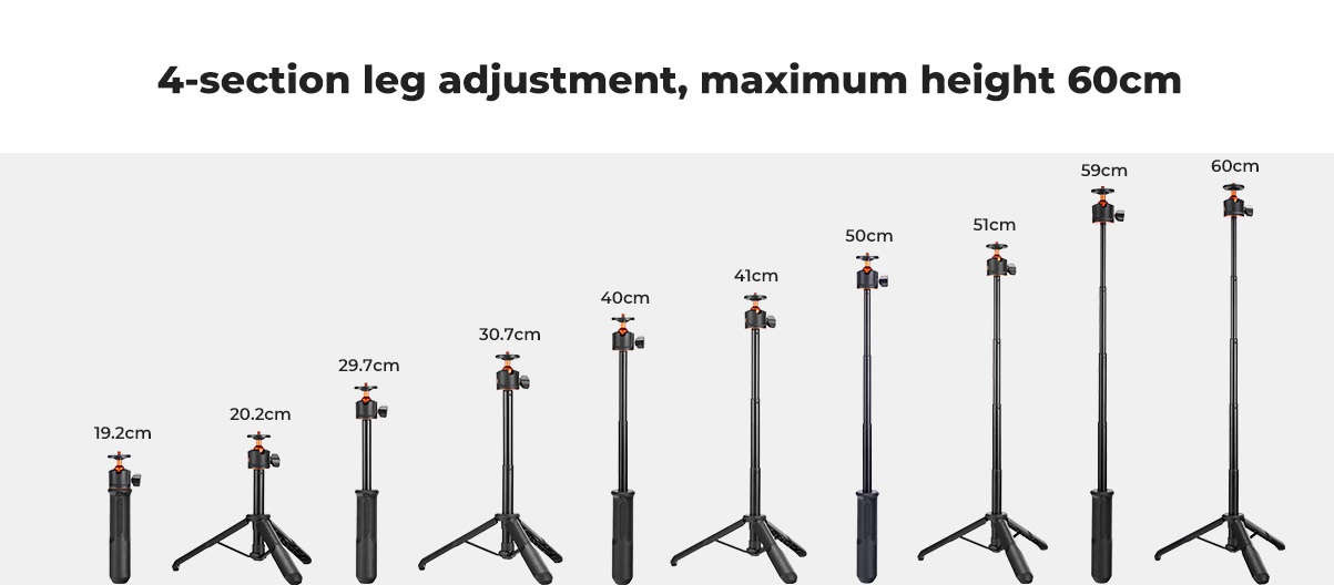 Horní část stativu má 1/4" závit, na který lze namontovat jakékoli kompatibilní zařízení pro fotografování či natáčení. Vestavěný tlumicí gumový kroužek zvyšuje stabilitu a pevnost teleskopické konstrukce. Stativ má rozšířenou pevnou konstrukci a na spodní straně protiskluzovou silikonovou podložku pro stabilnější oporu.