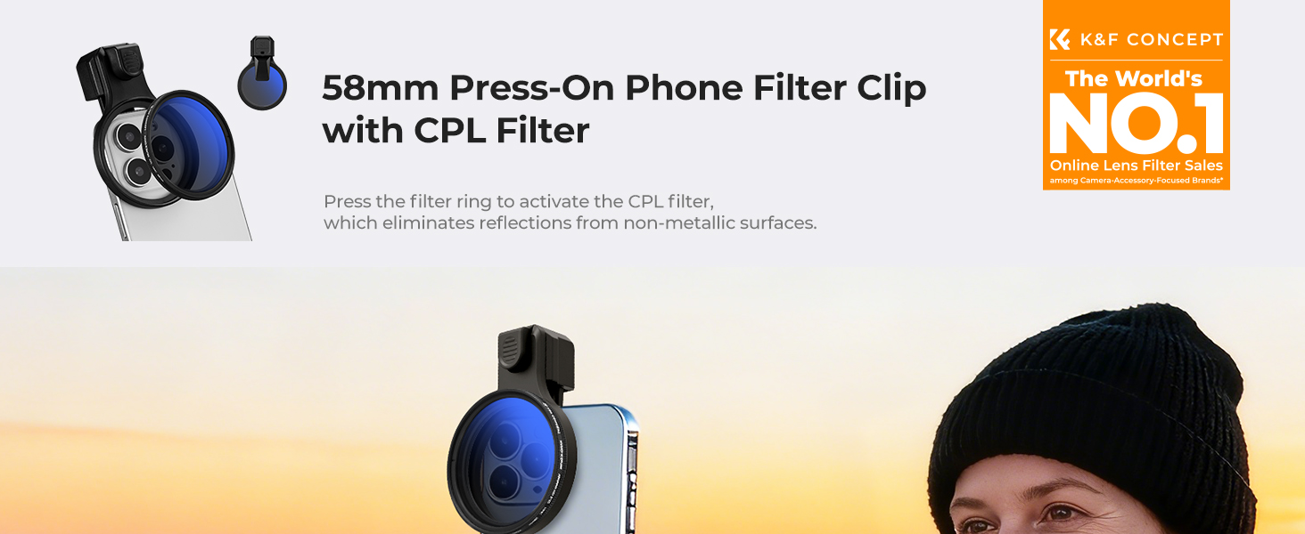 K&F Concept Nacvakávací držák 58mm s CPL filtrem pro mobily včetně odolného pouzdra je ultralehký polarizační filtr s klipem pro iPhone a smartphony KF15.0024