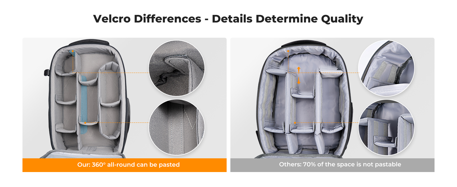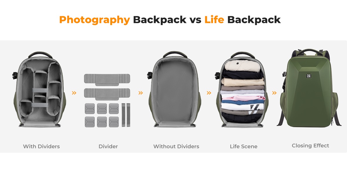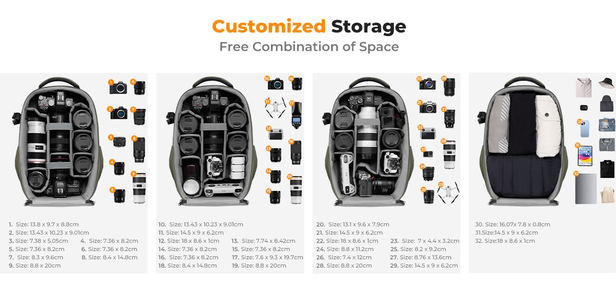 Přední plně otevíratelný klapkový vstup s tvrdou skořepinou chrání fotoaparát před nárazy a škrábanci. Batoh má 2 vnitřní kapsy na příslušenství pro kabely, SD karty a powerbanku. Na zadní straně je skrytá zipová kapsa na telefon, peněženku a drobné předměty. Stativ lze pevně připnout pomocí popruhu na jedné straně batohu. Na druhé straně je kapsa na deštník nebo láhev s vodou.