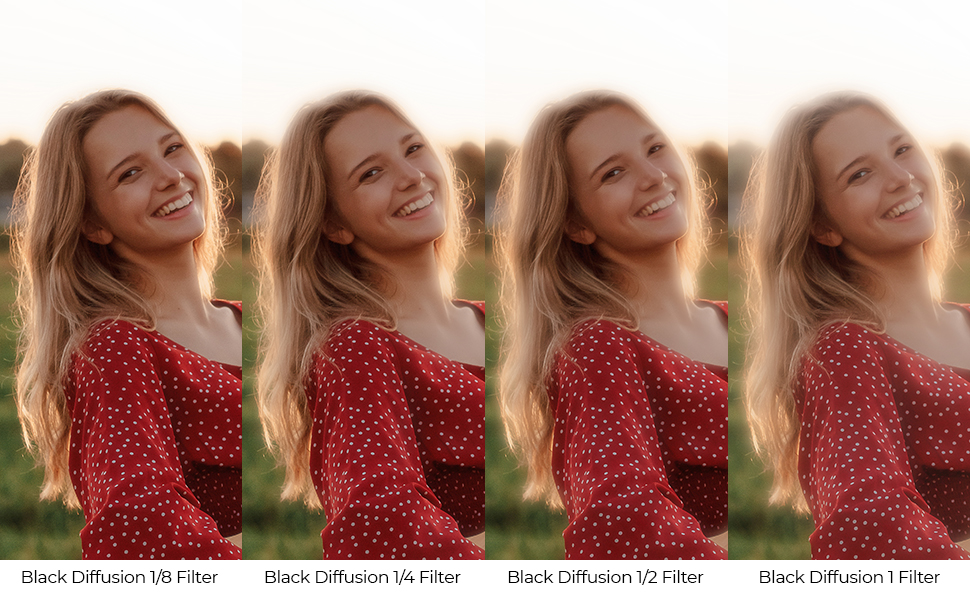 Černé difuzní filtry lze využít ve více žánrech fotografie i videa. Mezi jejich klíčové vlastnosti patří změkčení pleťovky a pomoc s eliminací odlesků. Při použití v protisvětle získáte zjemnění světelného zdroje, hodí se tak i pro noční záběry nebo street fotografii. Filtry se dají kombinovat a použít i současně.