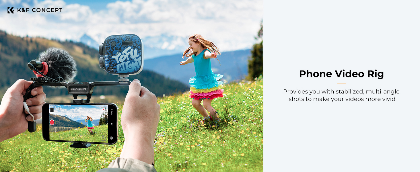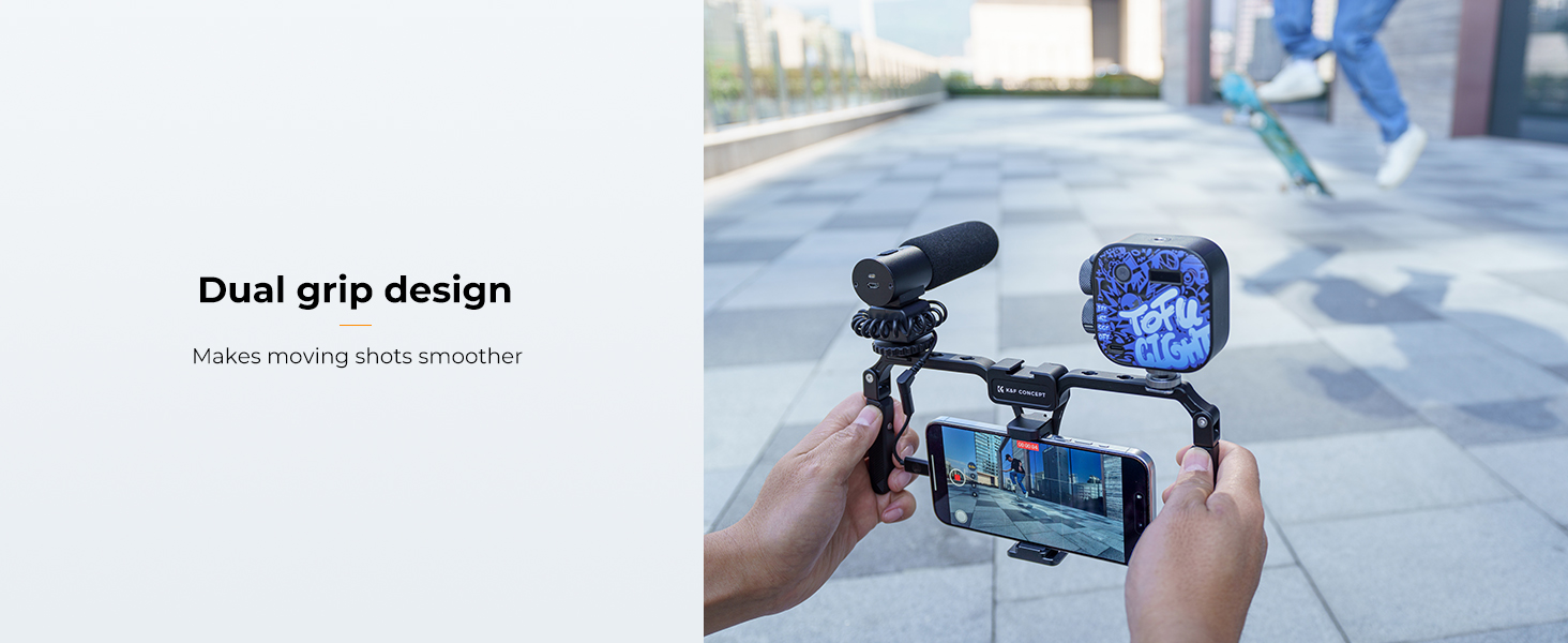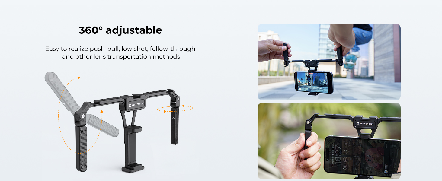 Při natáčení s mobilním telefonem zajišťují plynulejší a stabilnější obraz. Rig podporuje funkci otočení madel o 360°, což usnadňuje pohyb push-pull, nízké záběry, sledování a další způsoby pohybu kamery, díky čemuž získáte více úhlů a kreativních možností natáčení.