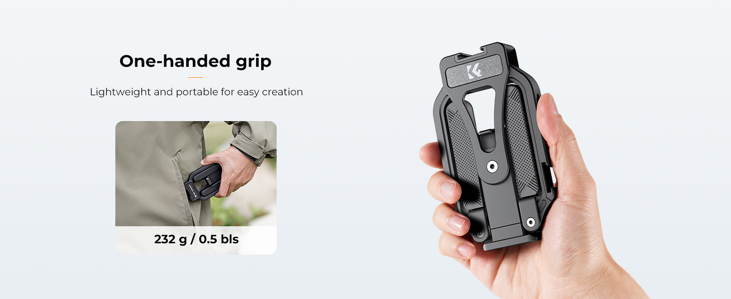 Smartphone Video Rig je velmi malý a lehký, váží pouhých 232 g. Je snadno skladovatelný, přenosný a pohodlný k použití. Ať už cestujete, jste venku nebo natáčíte běžně, můžete jej vzít kdykoli a kdekoliv pro pohodlné natáčení kvalitních videí.