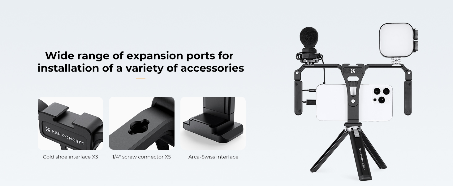 Rig je vybaven třemi cold shoe paticemi (sáňkami) a 5 standardními 1/4" závity, které umožňují snadnou instalaci a použití doplňkových zařízení jako jsou světla, mikrofony nebo jiné příslušenství pro zvýšení kvality a efektu natáčení. S rozhraním standardu Arca-Swiss lze rig také připevnit na stativ.