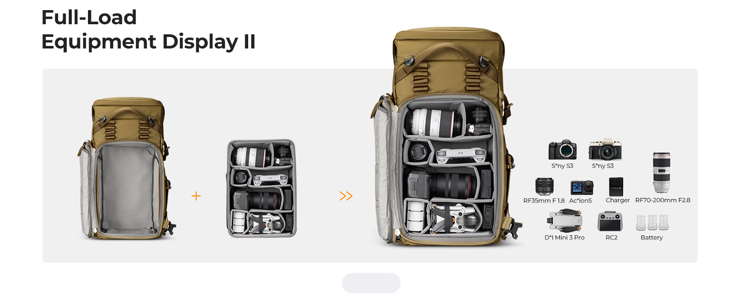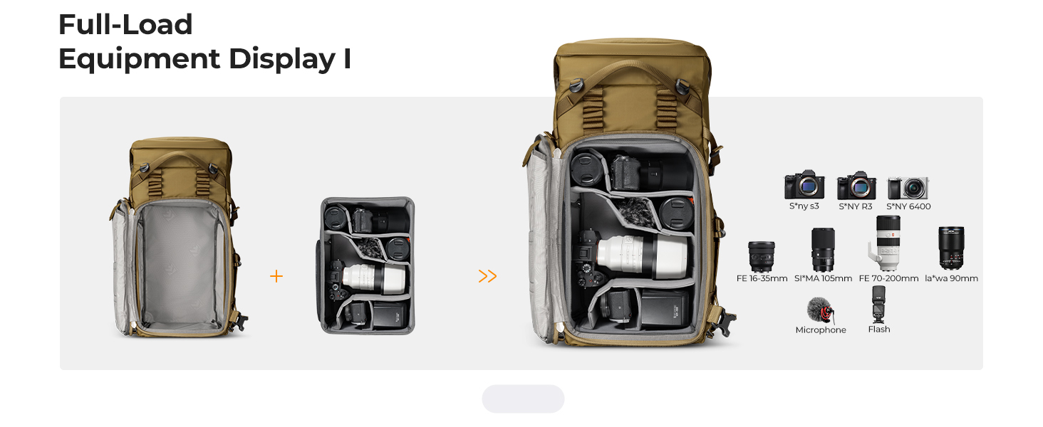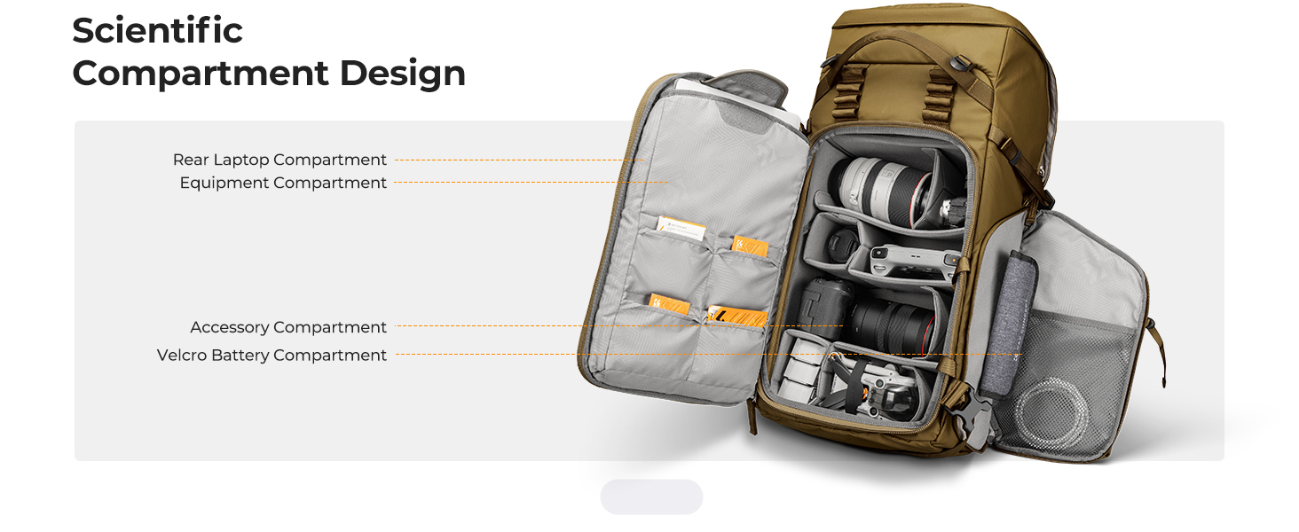 Obří kapacita 40 litrů: Spodní hlavní komora bez problémů spolkne až 2 těla fotoaparátů (kompatibilní s modely Sony, Canon, Nikon, Fuji), 6 objektivů a kompaktní dron. Už nemusíte dělat kompromisy v tom, co si vezmete s sebou.