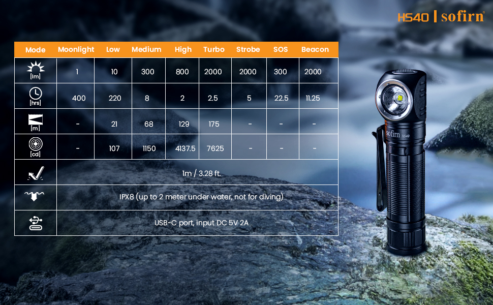 Odolná a voděodolná: Svítilna s krytím IP68 může dobře fungovat i v silném dešti. Tuto svítilnu lze dočasně ponořit pod vodu na určitou dobu (až 2 metry) v případě náhodného pádu při plavbě lodí nebo rybaření. Její odolné hliníkové tělo a odolnost proti nárazům odolávají hrubému zacházení. Svítilna není určena pro potápění !