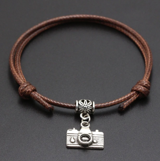 Stylový náramek na ruku s přívěskem fotoaparátu, tmavě hnědý